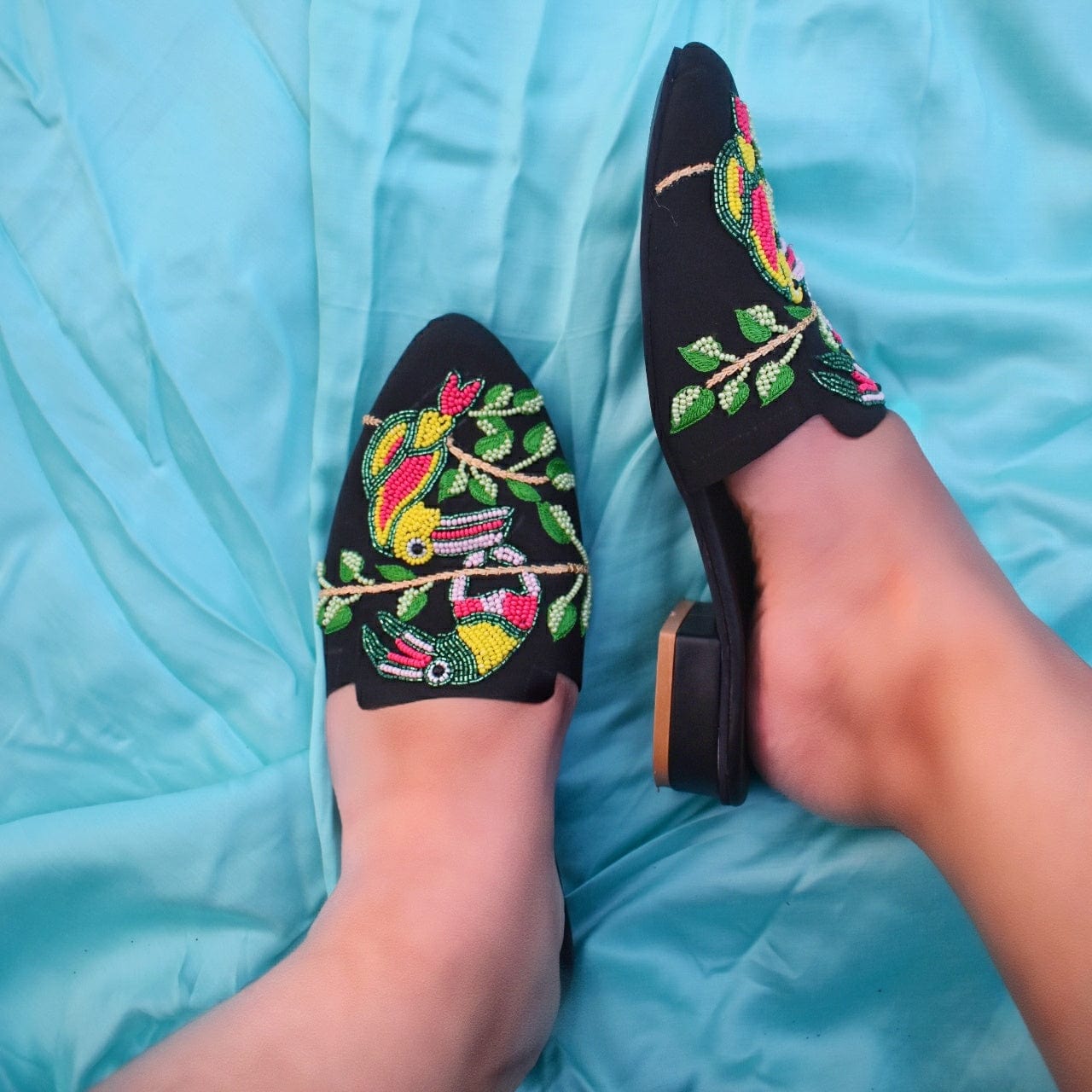 Adding a whole lot of fun to you outfit and will infuse with any outfit. Handcrafted by the best on a black base you’ve got kingfisher birds in the pop of multi coloured threads, beads and cut dana.