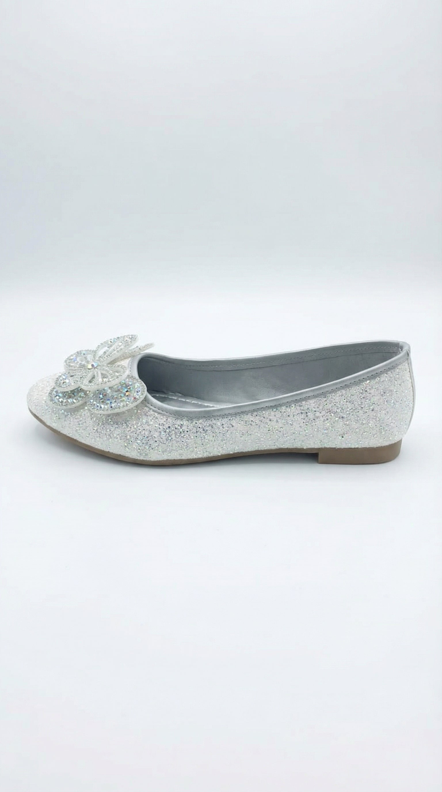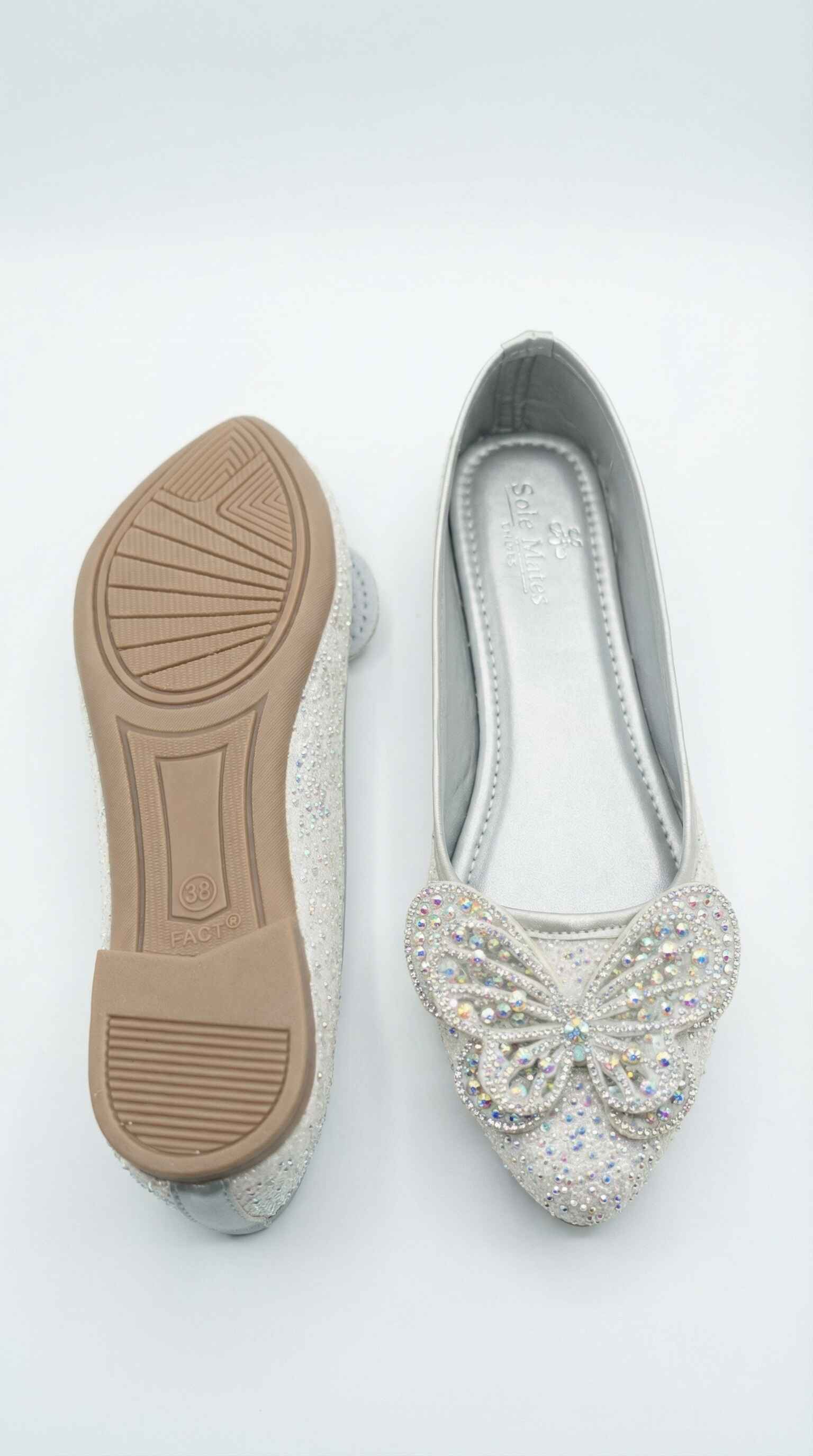 Step into timeless elegance with our Crystal Butterfly Ballerinas, designed to add a soft sparkle to every look. Crafted in premium shimmer rexine, this pair features a beautifully detailed butterfly motif adorned with fine crystals, creating a graceful statement with every step.
