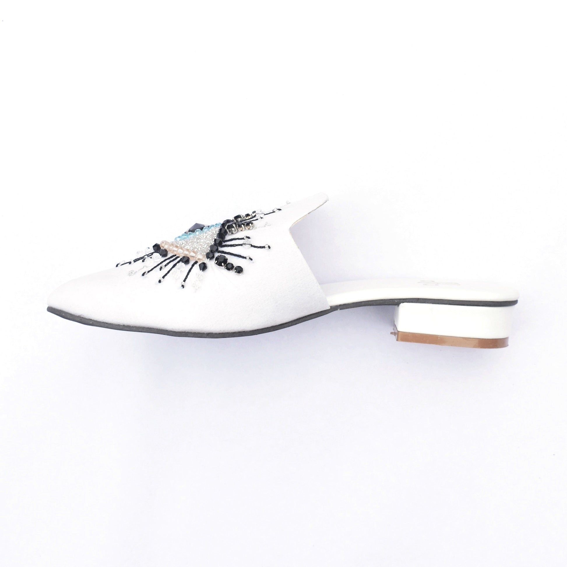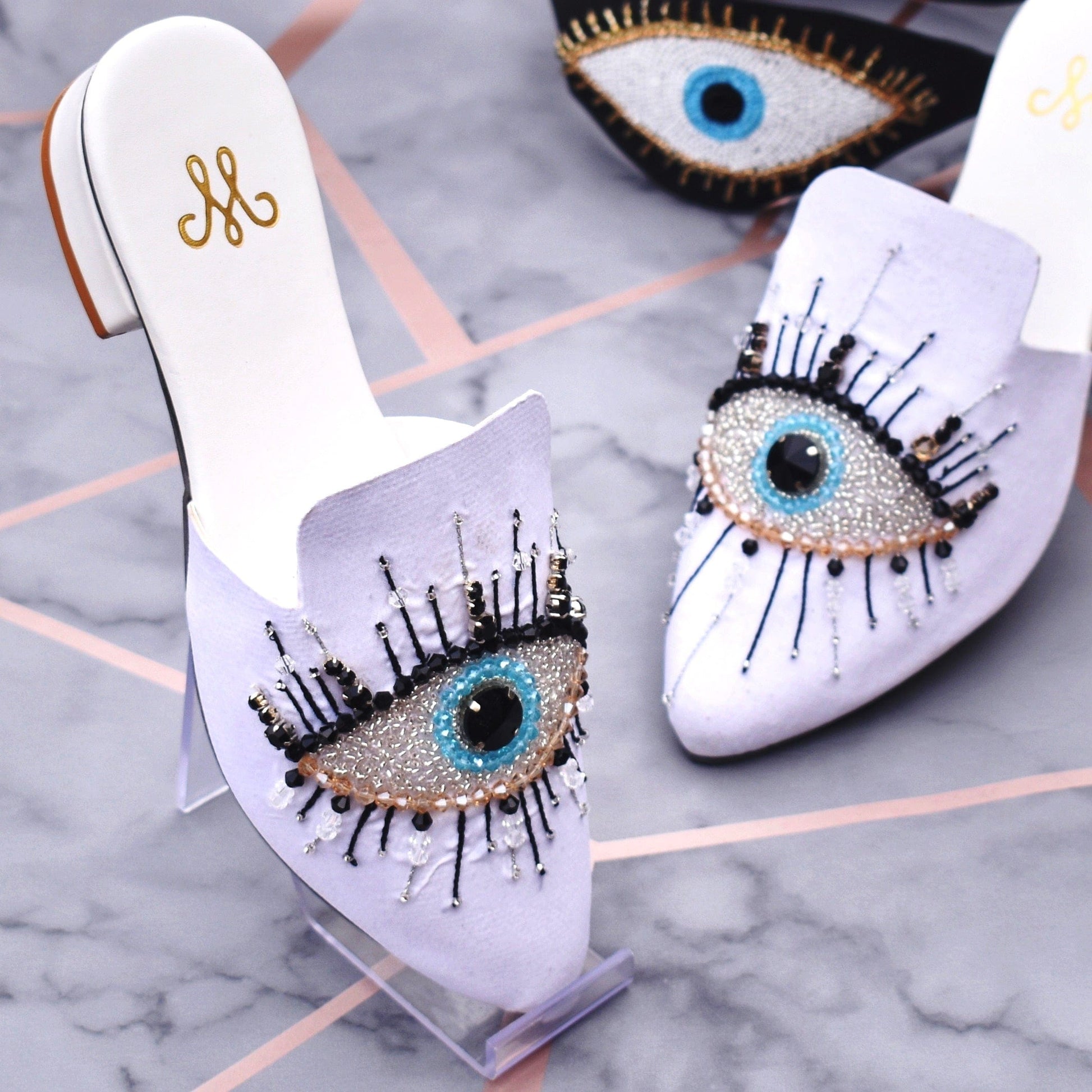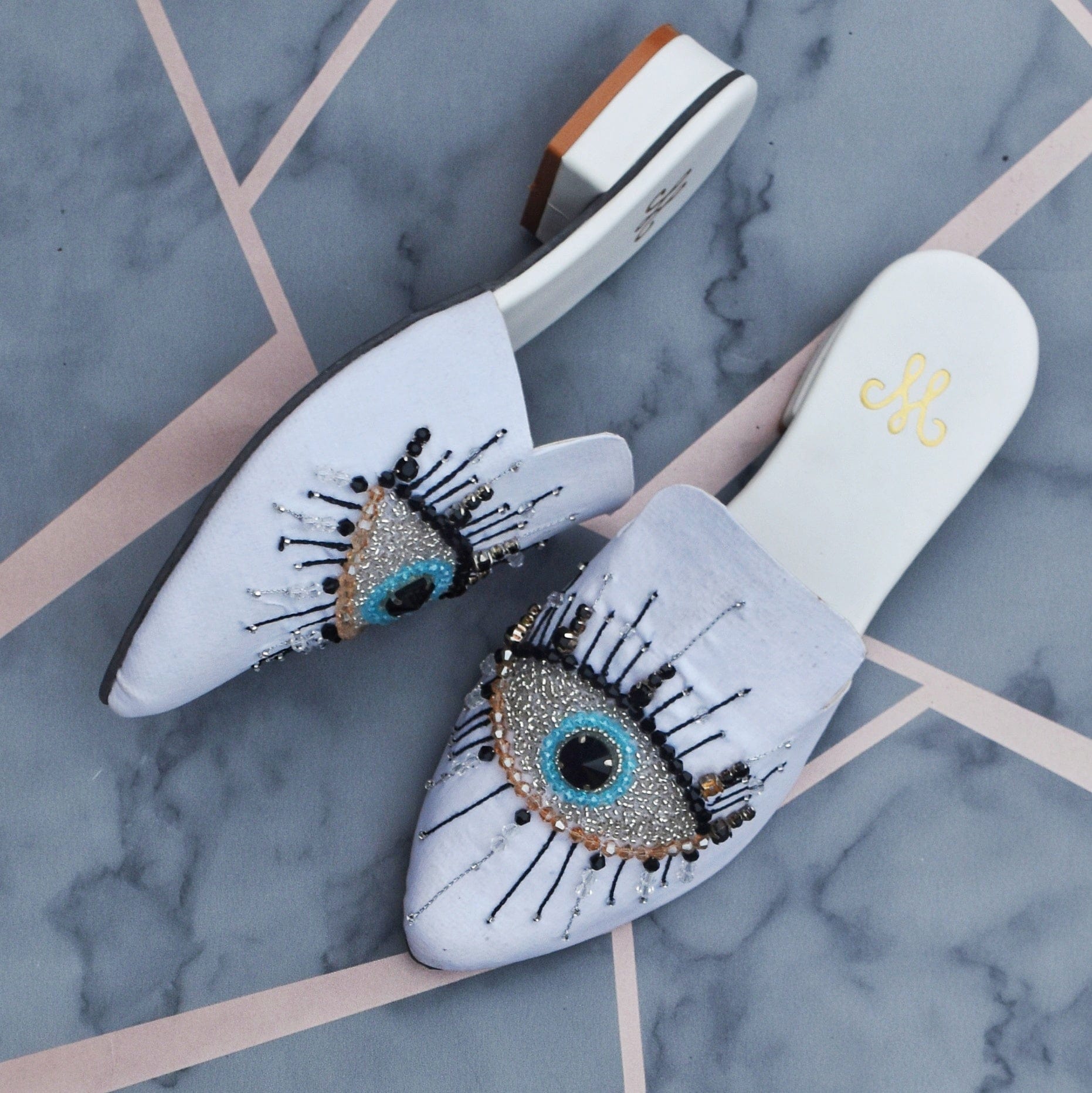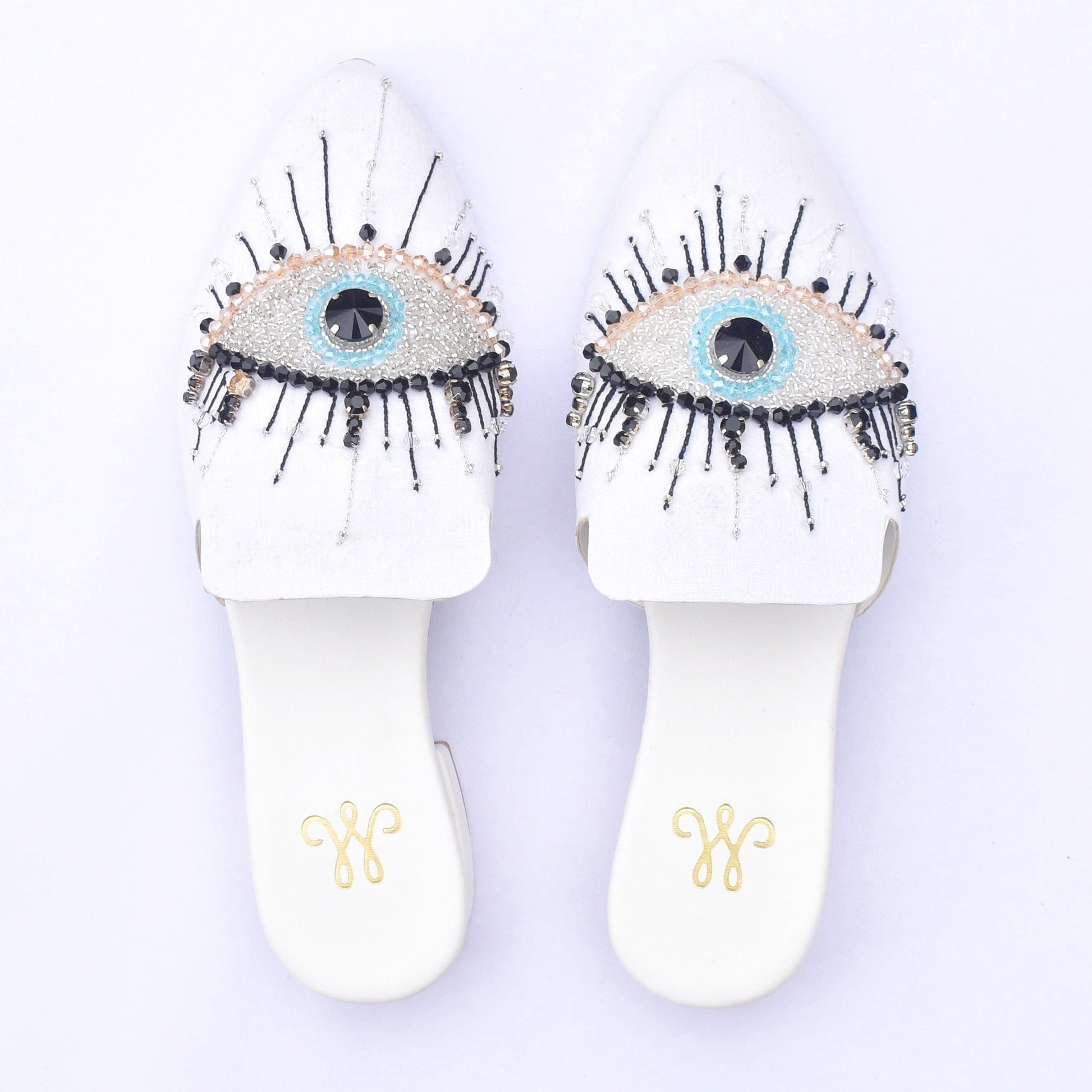 made on a white raw silk fabric, embellished with blue,white and gold crystals, these mules are so dynamic that they will go with most of your outfits. Keeping you away from all the bad vibes.